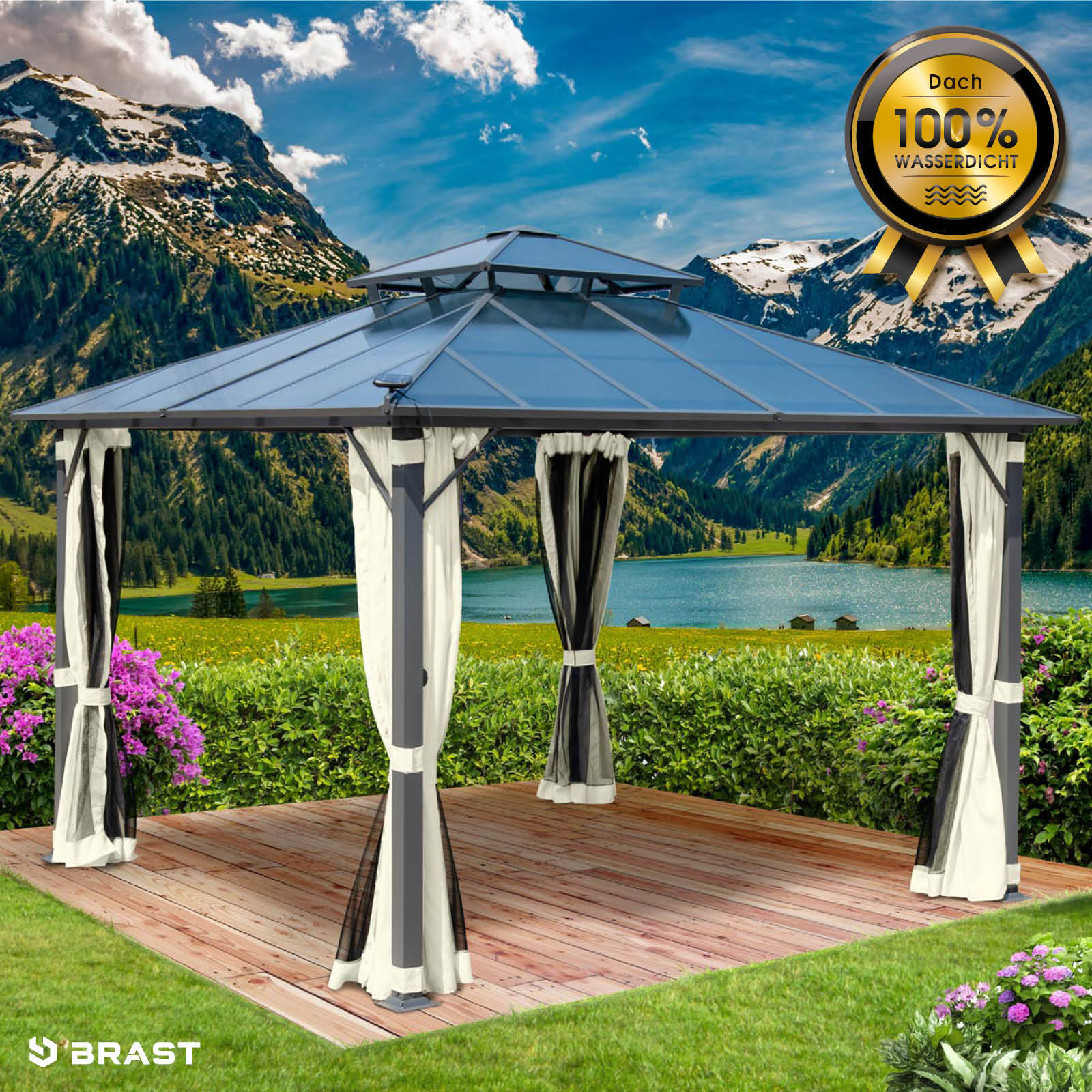 Die nächste Gartenparty steht vor der Tür und mit dem BRAST Aluminium Pavillon Pagode brauchen Sie sich um das Wetter keine Sorgen mehr zu machen. Genießen Sie unbeschwert mit Ihren Liebsten, geschützt vor Sonne, Wind und Regen.